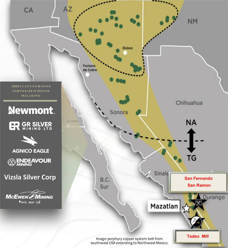 - 1,200-kilometre-long epithermal belt thatruns from Jalisco, Mexico to Arizona, USA.- The region contains a series of CopperPorphyry Systems (CPS); an occurrence thatindicates a larger amount of gold, silver andlead resource.